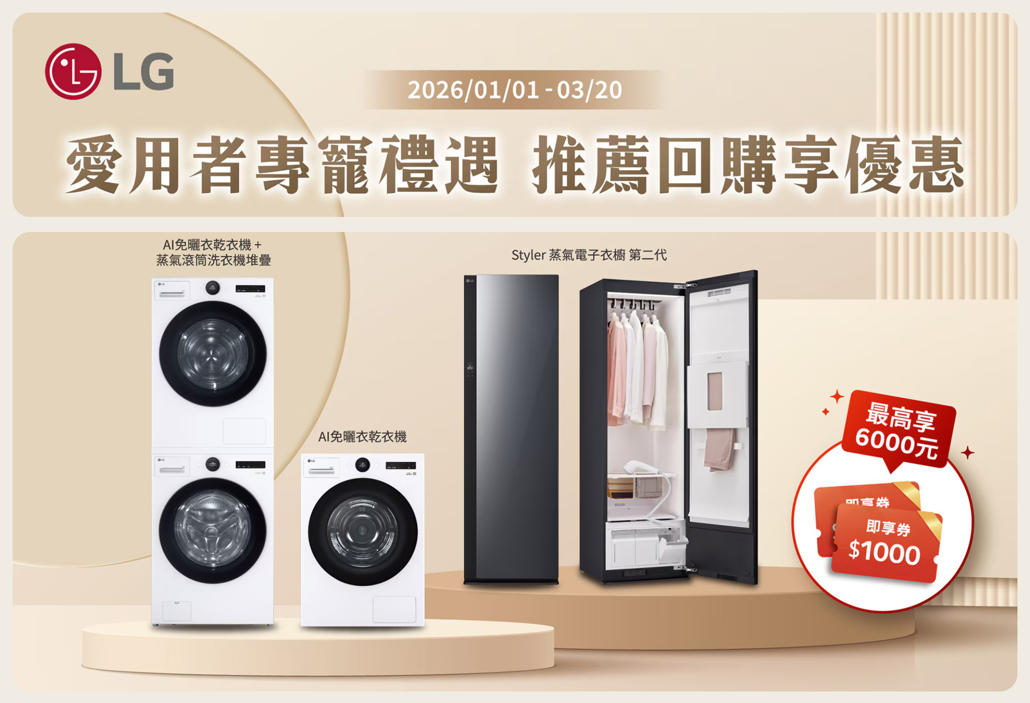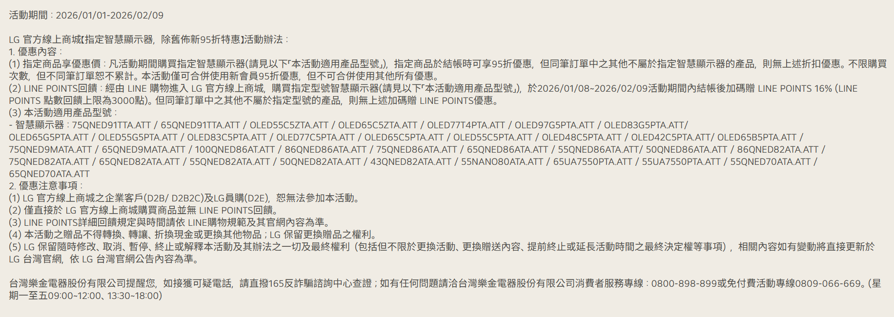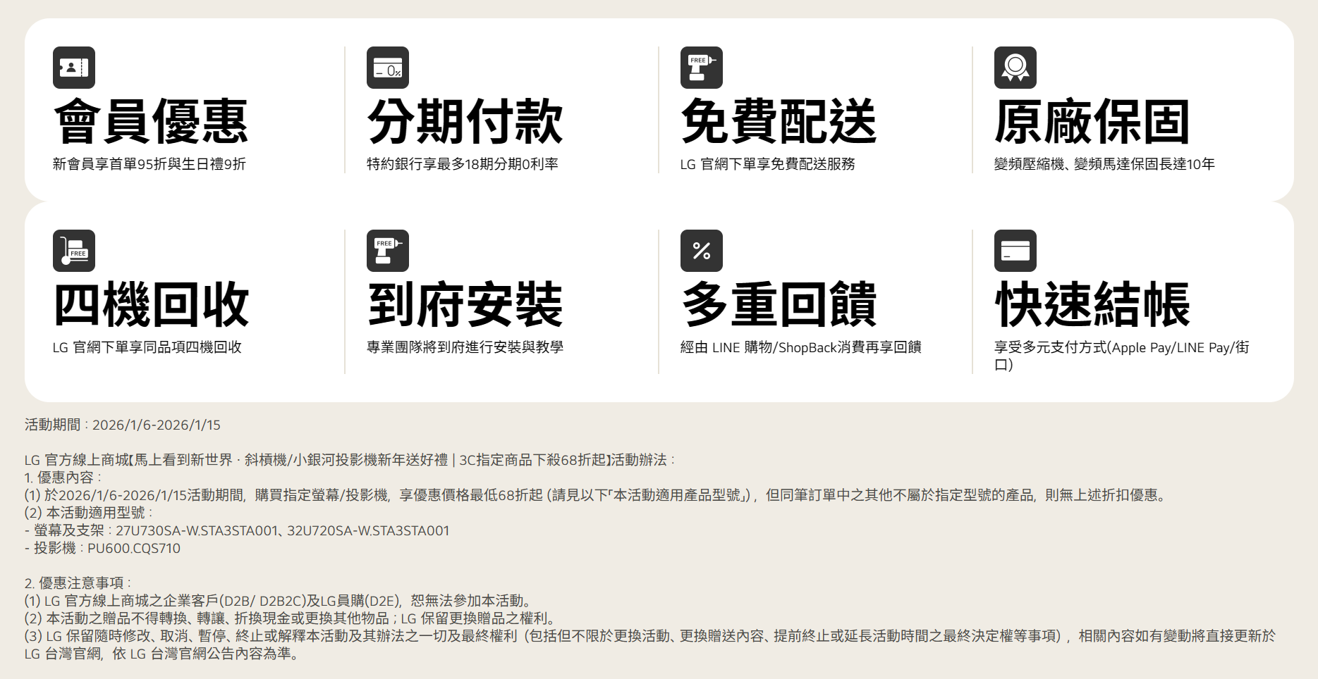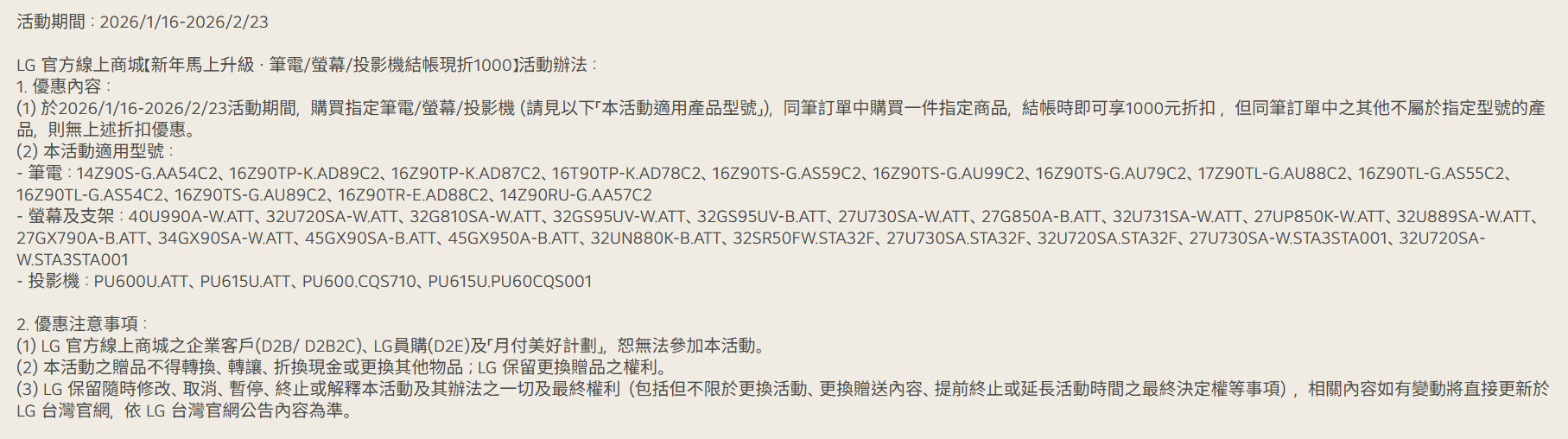 (1) LG 官方線上商城之企業客戶(D2B/ D2B2C)及LG員購(D2E),恕無法參加本活動。