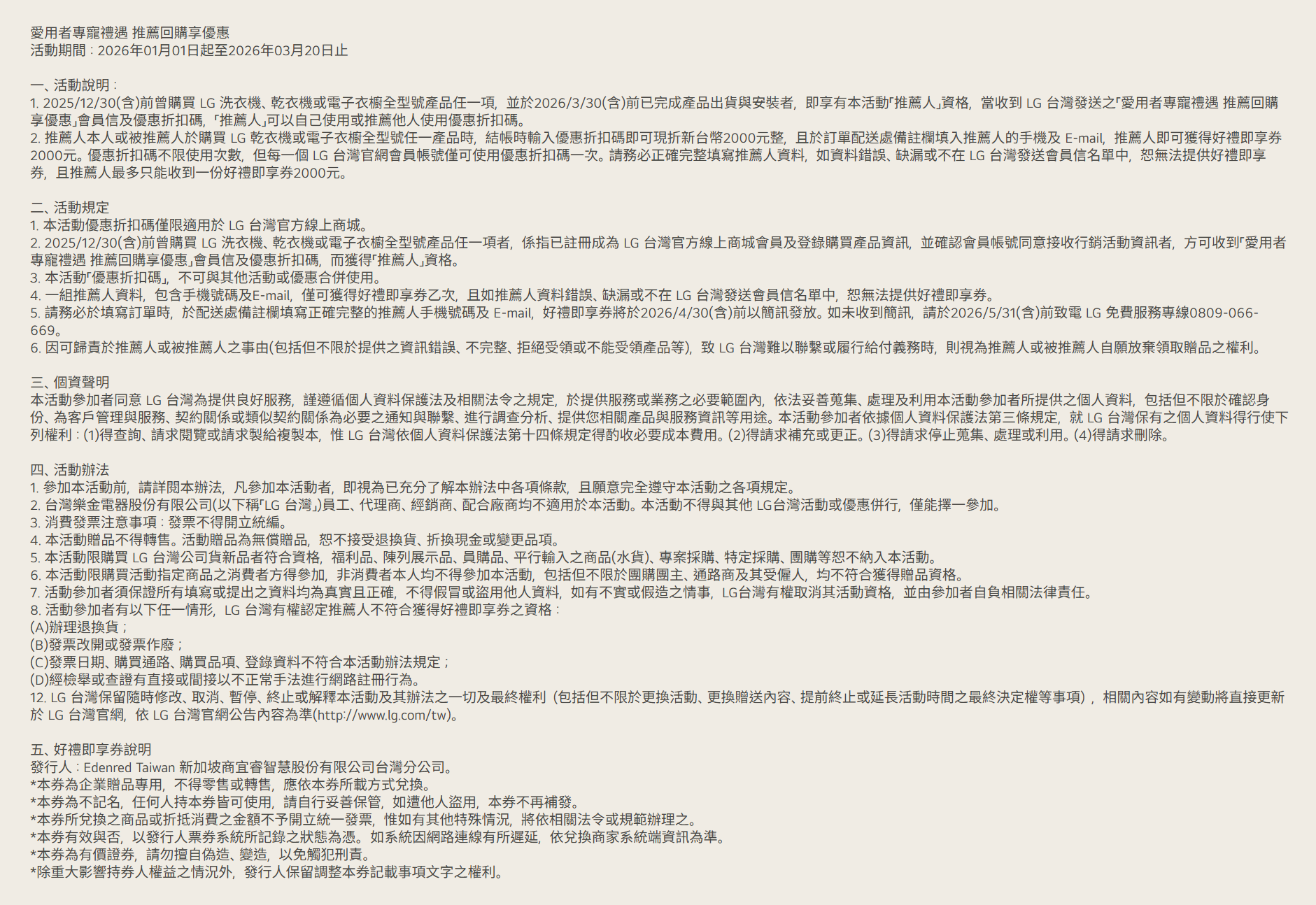 (2) 本活動之贈品不得轉換、轉讓、折換現金或更換其他物品;LG 保留更換贈品之權利。