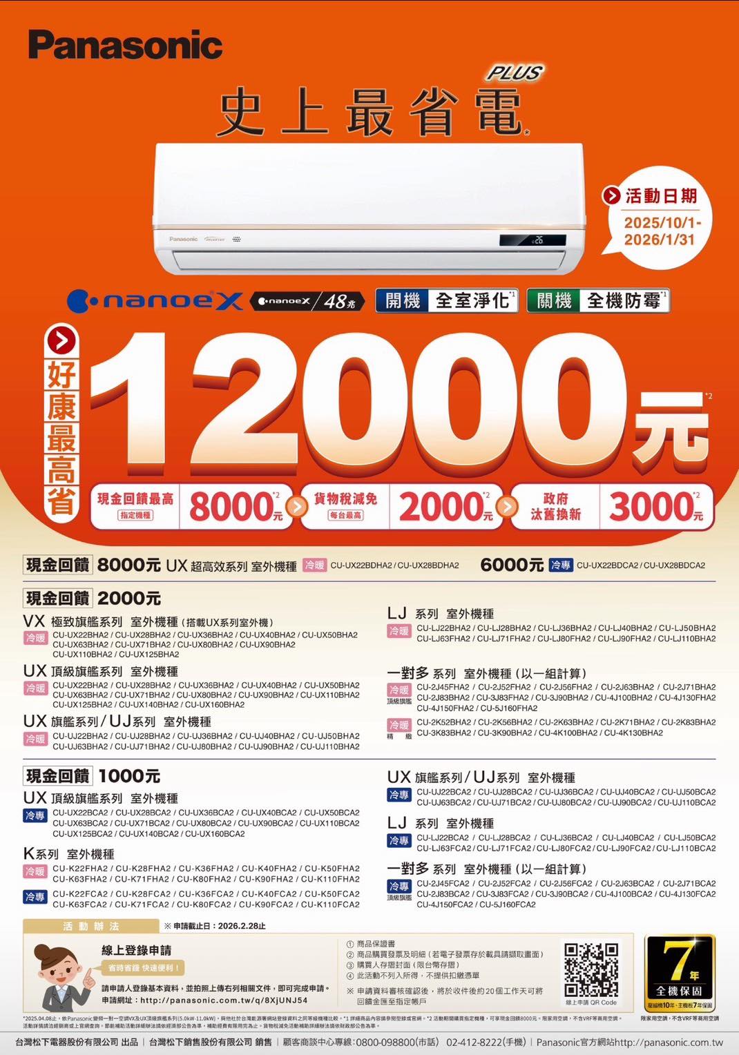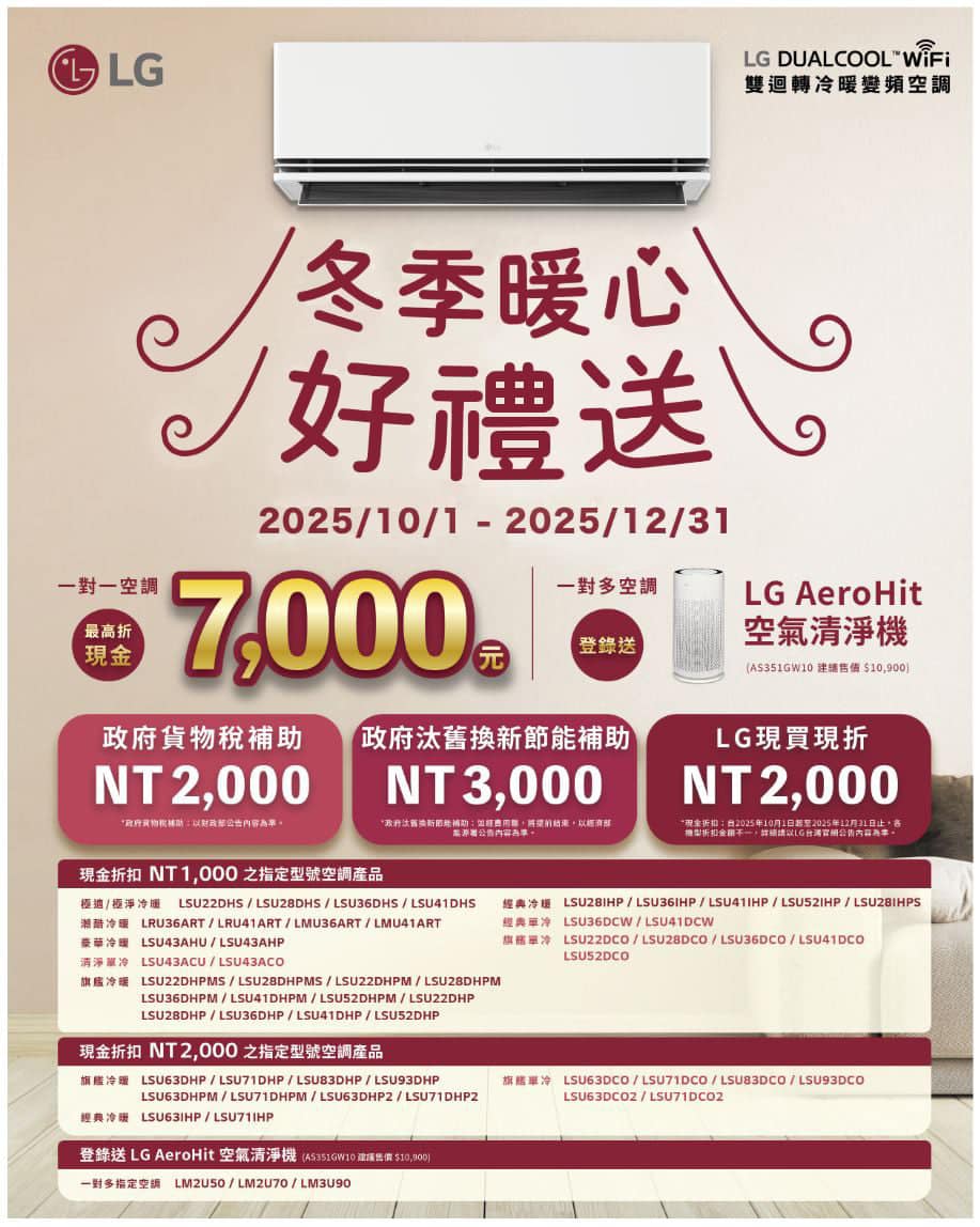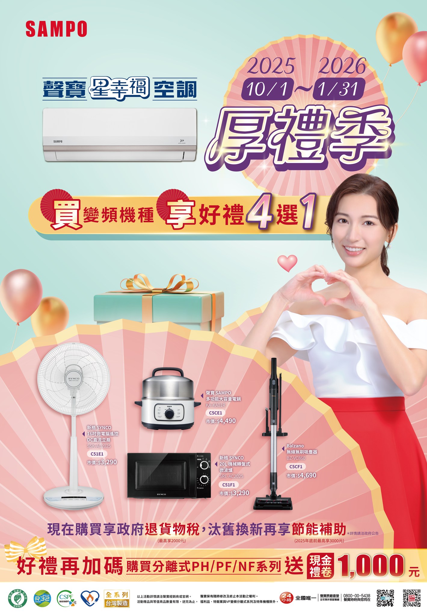 折扣優惠情報 【2025夏季】各品牌變頻空調 贈品文 貼文者 Ruby 2025-10-07 On 2024-01-29 0 目錄 LG 樂金(活動中) 活動期間2025/10/1~2025/12/31『冬季暖心好禮送』登錄時間:10/1於期間購買指定空調機型,並完成登錄審核凡購買 LG 一對一空調指定型號,政府貨物稅補助與政府汰舊換新節能補助加上LG現金折扣,最高省7,000元。凡購買 LG 一對多空調指定型號,除政府貨物稅補助與政府汰舊換新節能補助外,於2026年1月31日前完成登錄,並經審核通過,即贈 LG 空氣清淨機 (AS351GW10) 乙台。活動詳情 https://bit.ly/3XnnYcaLG冷氣馬上挑<< DAIKIN 大金(活動中) 活動期間2025/10/01~2025/12/31『拿現金 卡實在』活動期間購買大金家用變頻空調一對一、一對多、輕商用冷專系列機型,可享現買現扣2000元/組。還可申請政府節能補助3000元/組,貨物稅退稅2000元/組,最高超值優惠7000元!大金冷氣馬上挑<< Panasonic 國際牌(活動中) 活動期間2025/10/01~2026/01/31『史上最省電 PLUS』只要在活動期間購買家用空調指定機種,好康最高省12000元。符合資格還可再搭配政府補助汰舊換新3000元+減徵貨物稅2000元,雙重優惠快點把握機會!Panasonic冷氣馬上挑<< 詳情點我喔 HITACHI 日立(活動結束) 活動期間2025/4/1~2025/07/31『60年大感謝』只要在活動期間購買家用變頻冷氣指定機種,月月送百萬現金,早買機會多!符合資格還可再搭配政府補助汰舊換新3000元+減徵貨物稅2000元日立冷氣馬上挑<< 詳情點我喔 三菱重工(活動結束) 活動期間2025/06/10~2025/08/31只要於活動期間內完成保固登錄即可參加抽獎,不限機型、不限購買時間。符合資格還可再搭配政府補助汰舊換新3000元+減徵貨物稅2000元三菱重工冷氣馬上挑<< 詳情點我喔 SAMPO 聲寶(活動中) 活動期間2025/10/01~2026/01/31 『厚禮季』只要在活動期間購買聲寶變頻機種享好禮四選一,買分離PH/PF/NF系列加碼再送現金禮券1000元。符合資格還可再搭配政府補助汰舊換新3000元+減徵貨物稅2000元。聲寶冷氣馬上挑<< 詳情點我喔 HERAN 禾聯(活動中) 活動期間2025/10/01~2026/01/31『滿貫好禮大放送』只要在活動期間購買指定機種,立即享有精美好禮電器5選1,有20L轉盤式微波爐、數位機上盒、變頻DC風扇、無線手持吸塵器、10人份電鍋。符合資格還可再搭配政府補助汰舊換新3000元+減徵貨物稅2000元。禾聯冷氣馬上挑<< 詳情點我喔 Gree 格力(活動結束) 活動期間2025/02/01~2025/04/30只要在活動期間購買指定機型冷氣(GAR/GPS/GPR/GKS/1對1多外機/1對1埋入/櫃機/5馬力),即可享有好禮5選一! 有果汁機、氣炸鍋、遙控立扇、曼托瓦和威尼斯不沾鍋具。符合資格還可再搭配政府補助汰舊換新3000元+減徵貨物稅2000元,贈品、折扣通通不放過~格力冷氣馬上挑<< SANLUX 三洋(活動結束) 活動期間2025/02/03~2025/04/30活動期間購買三洋分離式或窗型冷氣,即送電器好禮5選1,有快煮壺、咖啡機、循環桌立扇、遙控立扇、電子鍋…等,喜歡什麼挑什麼~符合資格還可搭配政府補助汰舊換新3000元+減徵貨物稅2000元,真的省超多!。三洋冷氣馬上挑<< 詳情點我喔 TECO 東元(活動結束) 活動期間2025/05/01~2025/06/30活動期間購買東元指定機型HS8系列冷氣,完成活動登錄表單送吸塵器!符合資格還可搭配政府補助汰舊換新3000元+減徵貨物稅2000元,雙重折扣最高省下5000,真的省超多!。東元冷氣馬上挑<< FUJITSU 富士通(活動結束) 活動期間2025/05/01~2025/09/30活動期間購買指定機種享雙重送優惠活動,政府貨物稅補助*1與政府汰舊換新節能補助*2加上富士通現金折扣*3,最高省7,000元!!精美好禮,網羅最實用的生活家電,注重生活品質又精打細算的您!富士通冷氣馬上挑<< Bd 冰點空調(活動結束) 活動期間2025/02/01~2025/04/30活動期間購買變頻全系列機種,立即贈好禮4選1,有直流馬達遙控風扇、隨行杯果汁機、沖牙機、電烤盤。符合資格還可搭配政府補助汰舊換新3000元+減徵貨物稅2000元,贈品+折扣雙重享受,現在不買還等什麼時候?冰點冷氣馬上挑<< 詳情點我喔 CHIMEI 奇美空調(活動結束) 活動期間2025/02/01~2025/05/31 活動期間購買奇美空調(變頻2.8KW以上機種)冷氣,享最低五折加購價好禮4選1,有立扇、空氣清淨機、快煮壺、吸塵器。符合資格還可搭配政府補助汰舊換新3000元+減徵貨物稅2000元,贈品+折扣雙重享受,現在不買還等什麼時候? 華菱冷氣(活動結束) 活動期間2025/02/01~2025/04/30活動期間購買華菱變頻/定頻分離式/窗型變頻冷氣乙組,享精美好禮六選一符合資格還可搭配政府補助汰舊換新3000元+減徵貨物稅2000元,贈品+折扣雙重享受,現在不買還等什麼時候?華菱冷氣馬上挑<< 詳情點我喔 Kolin 歌林(活動結束) 活動期間2025/02/01~2025/05/31活動期間購買歌林冷氣指定機種(20R變頻1對1系列),享好禮3選1符合資格還可搭配政府補助汰舊換新3000元+減徵貨物稅2000元,贈品+折扣雙重享受,現在不買還等什麼時候? TATUNG 大同(活動結束) 活動期間2025/01/01~2025/04/30活動期間購買大同空調指定機種,享好禮6選1,有微波爐、氣炸鍋、調理機、吹風機、立扇、電鍋唷! 符合資格還可搭配政府補助汰舊換新3000元+減徵貨物稅2000元,贈品+折扣雙重享受,現在不買還等什麼時候? 詳情點我喔 SHARP 夏普(活動結束) 活動期間2025/02/01~2025/04/30活動期間購買夏普空調指定機種,享好禮5選1,有點心機、磨豆機、電烤盤、循環扇、瞬熱開飲機..等 符合資格還可搭配政府補助汰舊換新3000元+減徵貨物稅2000元,贈品+折扣雙重享受,現在不