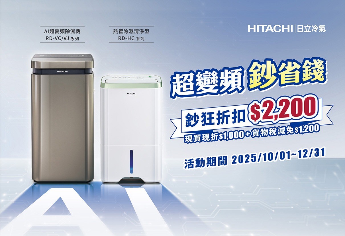活動辦法:活動期間2025年10月1日起至12月31日,凡購買日立冷氣指定除濕機種,即可享現金折扣1,000元,加上減免政府徵貨物稅最高可省2,200元。
