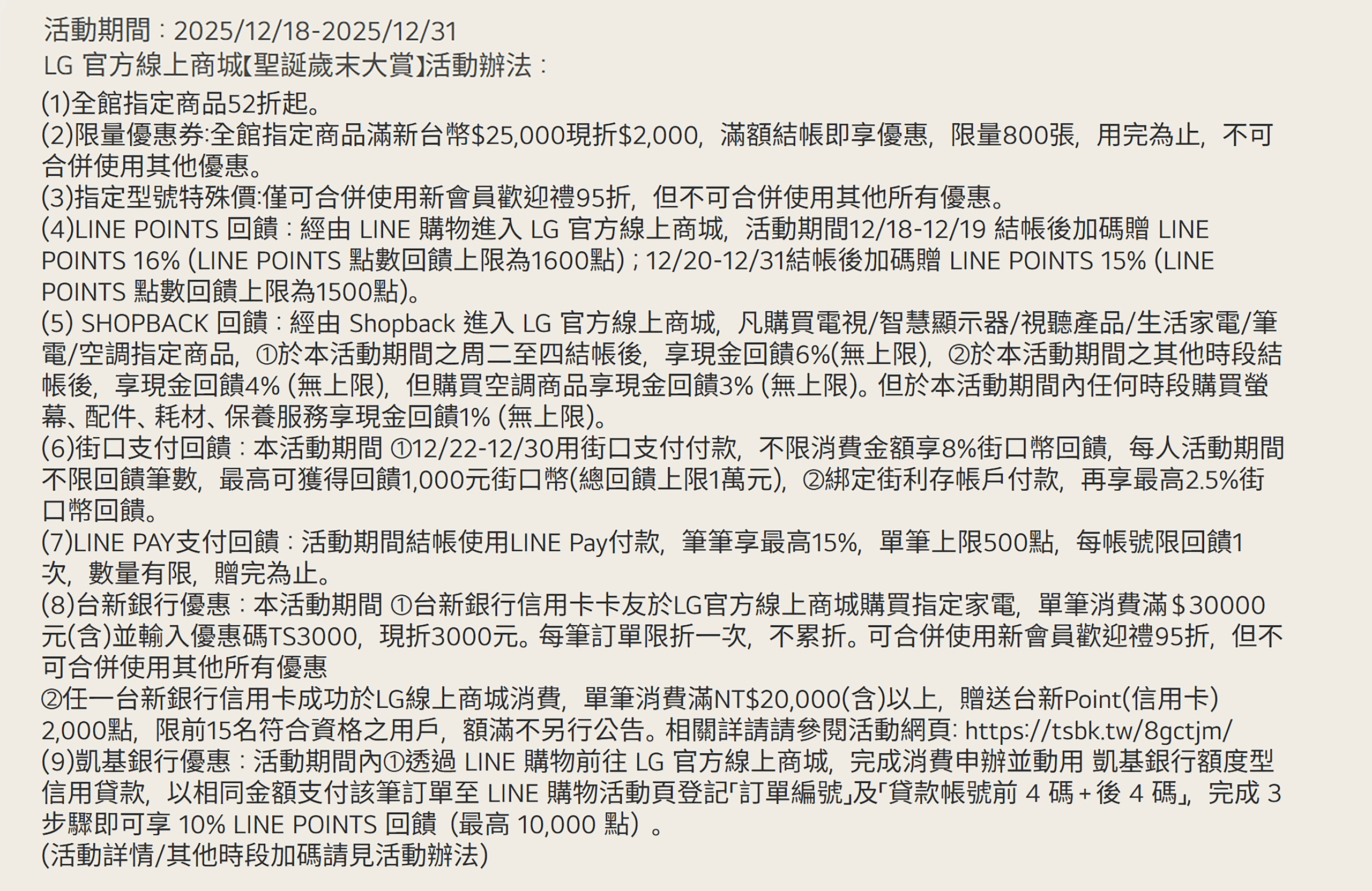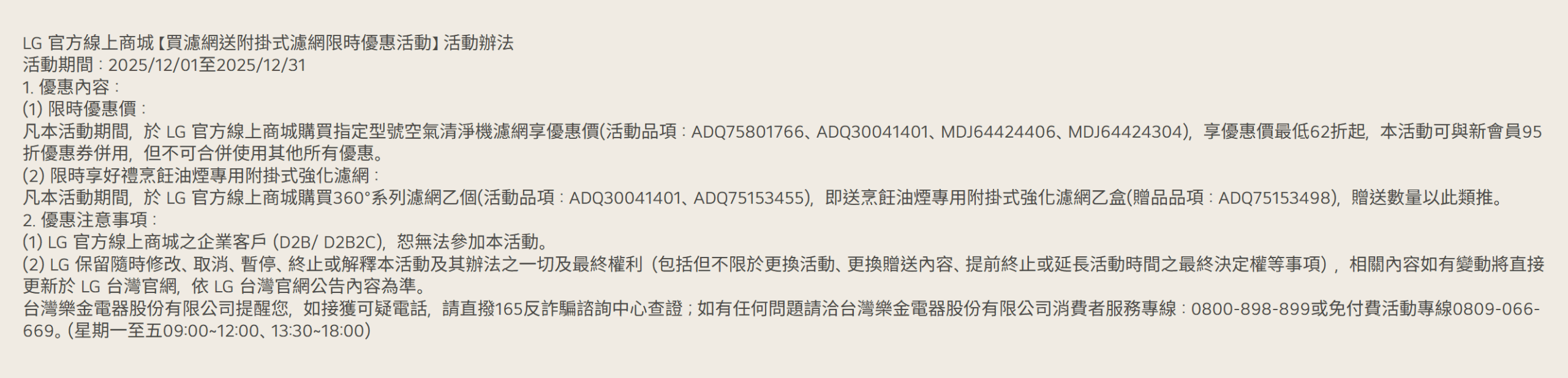 (1) LG 官方線上商城之企業客戶(D2B/ D2B2C)及LG員購(D2E),恕無法參加本活動。