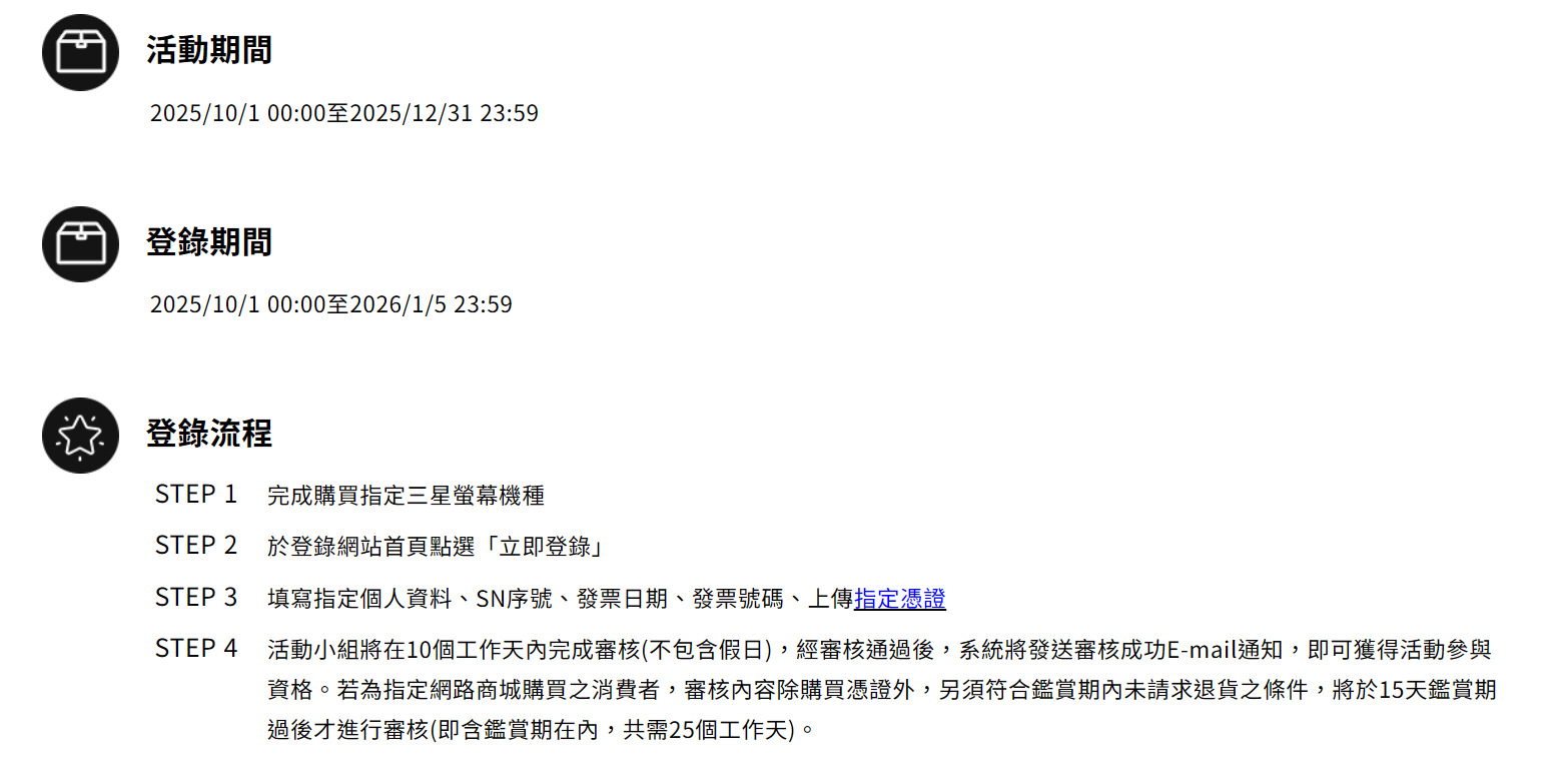 (1) 於2025/12/13-2025/12/31活動期間,購買任一指定筆電/螢幕/投影機,享優惠價格最低75折起 (請見以下「本活動適用產品型號」) ,但同筆訂單中之其他不屬於指定型號的產品,則無上述折扣優惠。